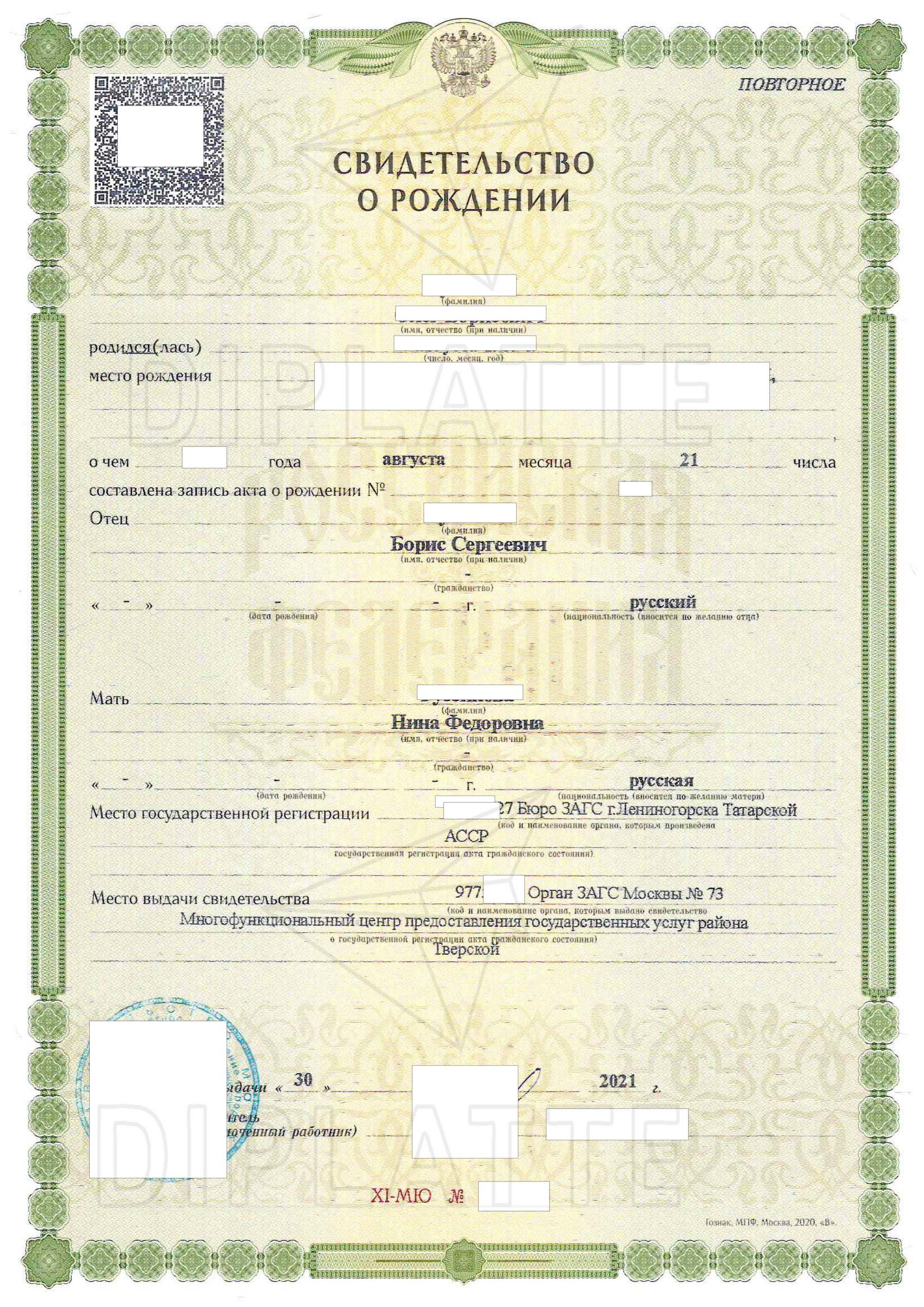 За дополнительную плату (на сентябрь 2024 года она составляет 10 000 рублей) у нас можно купить не только свидетельство о рождении, но и сделать апостиль на него или любой другой документ (например диплом, справку и т.п.). Апостиль понадобится вам для легализации документа за рубежом. Его делают профильные министерства, к которым относится выданный документ. Например свидетельства ЗАГС апостилируют органы ЗАГС или Министерство юстиции РФ. Если у вас есть образец нужного апостиля, то высылайте его нам и мы сделаем вам такой же, только с нужными изменениями. Если — нет, то не беда, у нас есть образцы апостилей практически со всех регионов России. И не только с органов ЗАГС, но и с МВД (если нужно апостилировать справку о несудимости) или Минобрнауки (если нужно заверить диплом, аттестат).