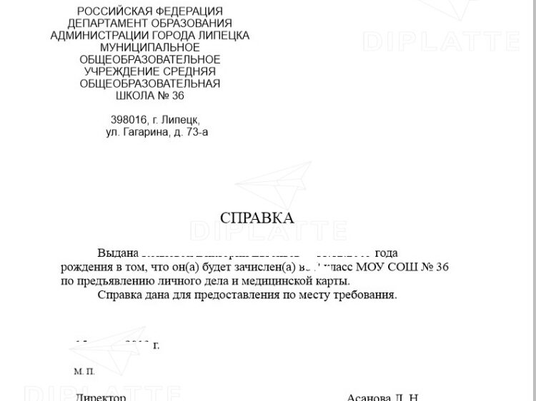 Подтверждение о принятии в школу